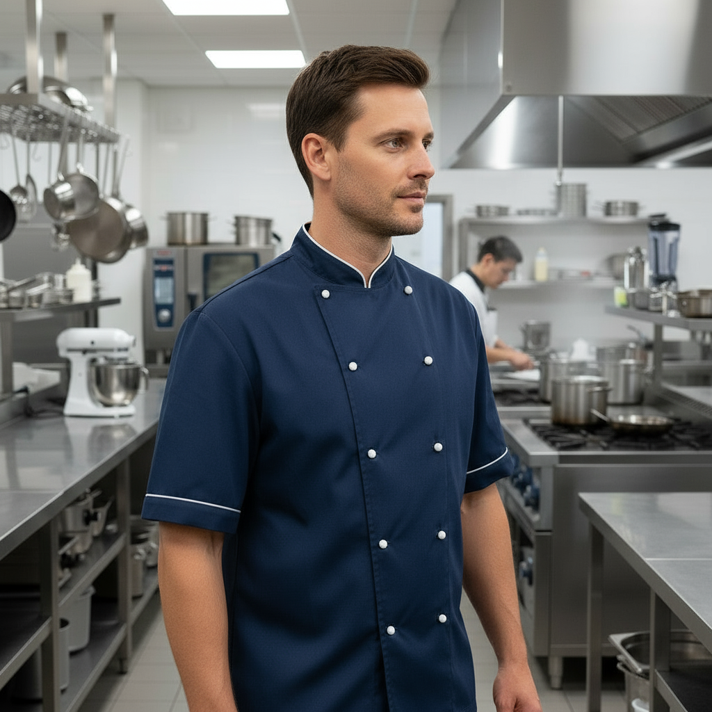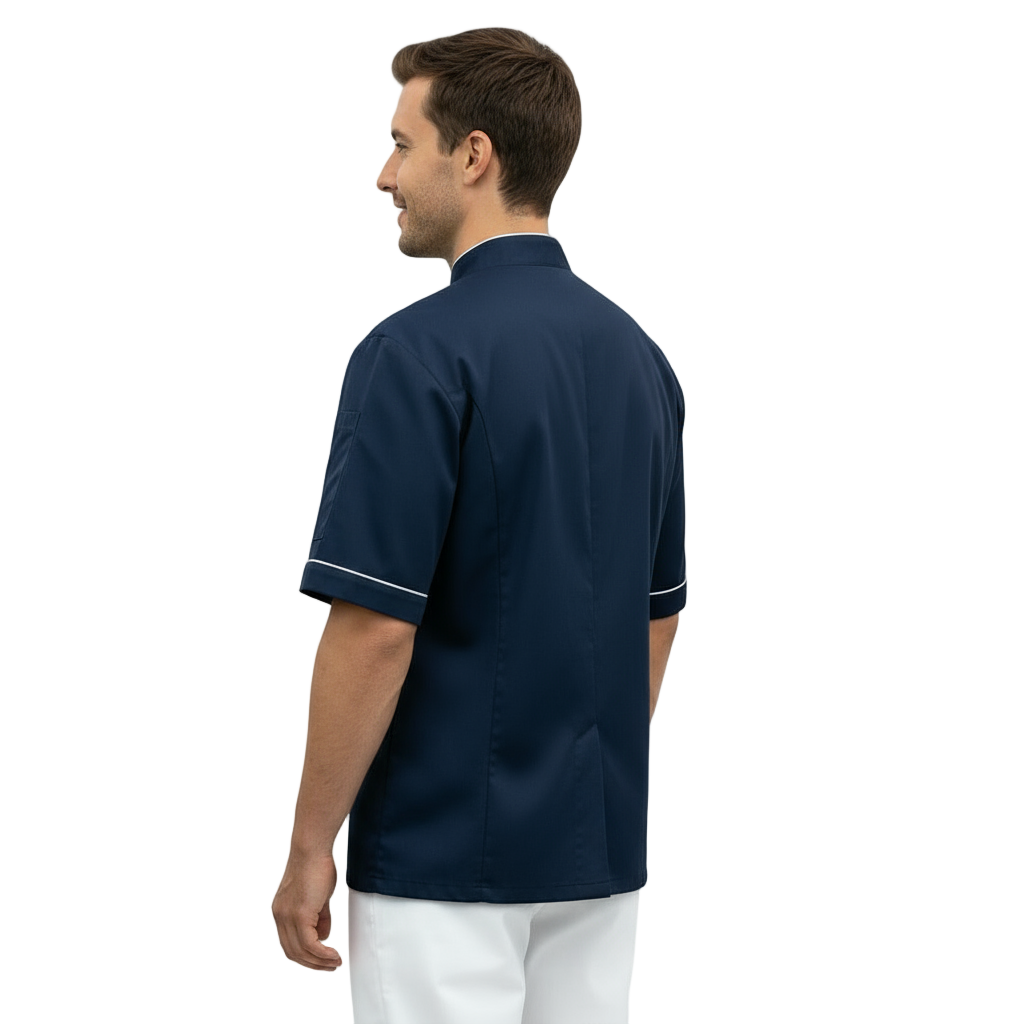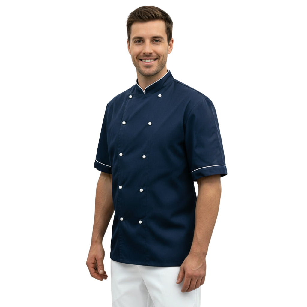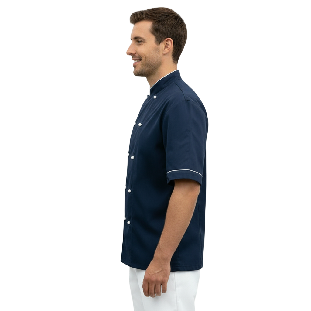 Giacca da cucina classica 100% cotone,made in itay,non sgualcisce e non si stropiccia.Mantiene la piega e tende a riacquisirla anche dopo i lavaggi permettendo di evitare la stiratura.Tale tessuto risulta inattaccabile da muffe e batteri.E' idrorepellente e non assorbe macchie di umidita',puo' essere reso un buon traspirante per lasciar passare il vapore acqueo,inoltre asciuga velocemente.