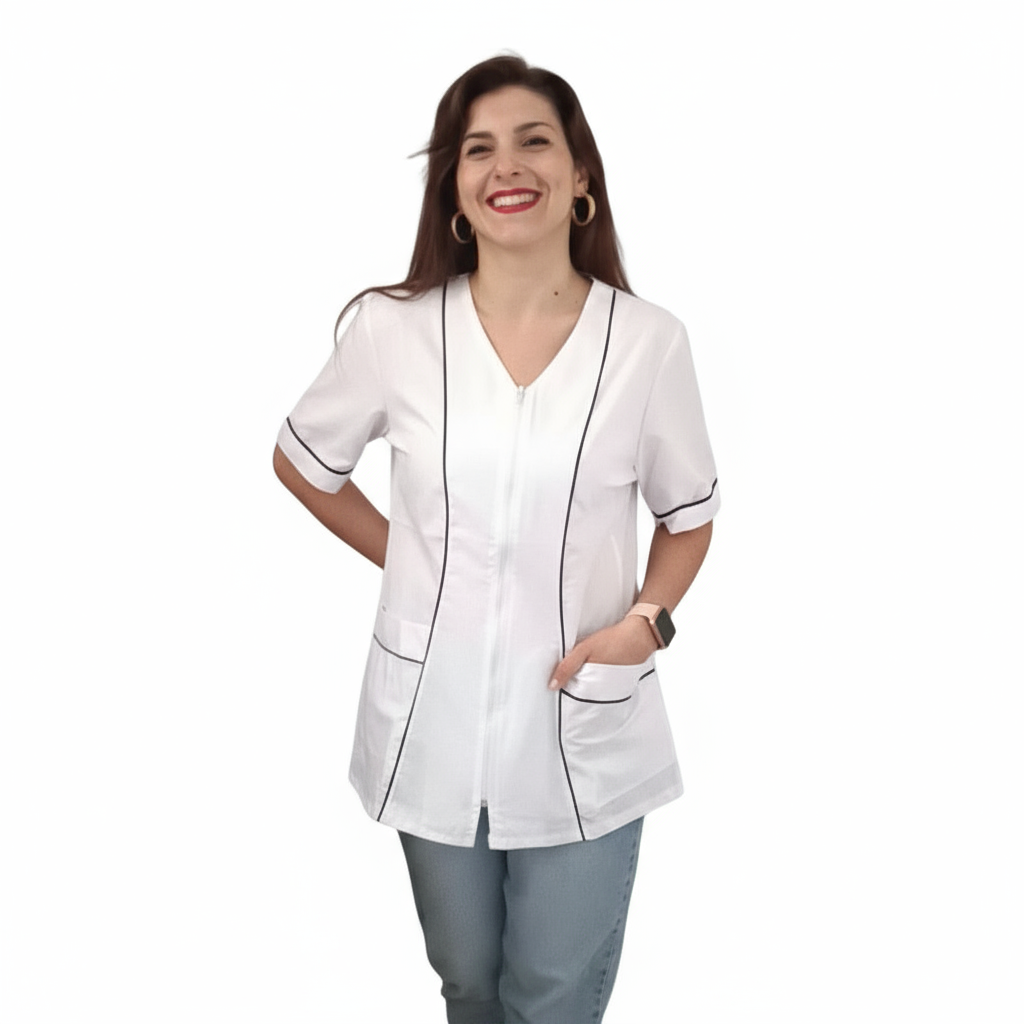 Questa elegante casacca da lavoro da donna con zip è ideale per chi lavora in ambienti come saloni di bellezza, parrucchieri, asili o nell'industria alimentare. Realizzata in un tessuto leggero e traspirante, offre comfort e libertà di movimento durante le lunghe giornate lavorative. La chiusura con zip frontale facilita l'indossarla e la toglierla rapidamente. Disponibile in quattro colori diversi, questa casacca professionale è facile da abbinare con il tuo abbigliamento lavorativo preferito. Mantieniti fresca e alla moda mentre svolgi le tue mansioni quotidiane con questo capo versatile e funzionale. Lavabile in lavatrice per una facile manutenzione.