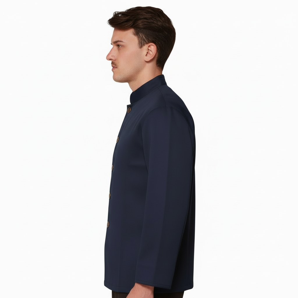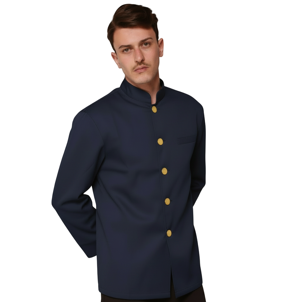 Giacca da Uomo BLU SCURO alla Coreana per Divisa Alberghi Hotel o Domestici. Giacca da uomo con collo alla coreana,bottoni dorati estraibili, ideale per facchini ,domestici,baristi e inservienti albergo. Abbottonatura centrale. Le rifiniture sono eccezionali, il materiale sopporta molteplici lavaggi mantiene colore e morbidezza.