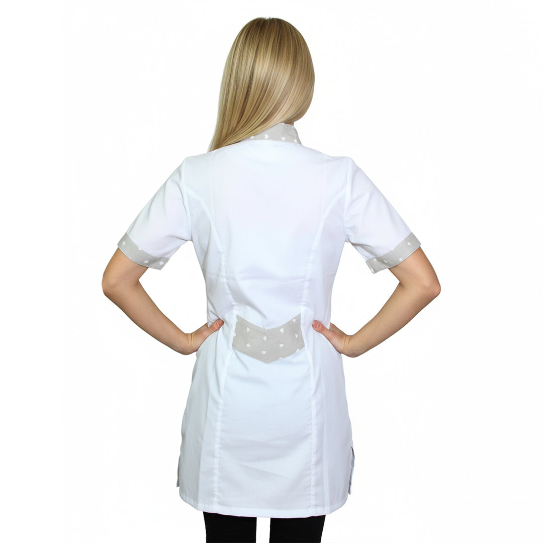 Camice slim-fit avvitato,in cotone elasticizzato,adatto a estetiste, parrucchiere ,cuoche oltre a tutta una serie di lavori sia gastronomici che sanitari. L'abbottonatura e' con bottoni a pressione ,di cotone made in italy. Bianco con inserti con cuoricini su collo e manica , di facile stiro e in misto cotone. Lavare come da etichetta . Offre elevata resistenza all’abrasione e alla lacerazione,non si sguacisce e non si stropiccia. Mantiene la piega e tende a riacquisirla anche dopo i lavaggi,asciuga inoltre velocemente ed e’ traspirante.